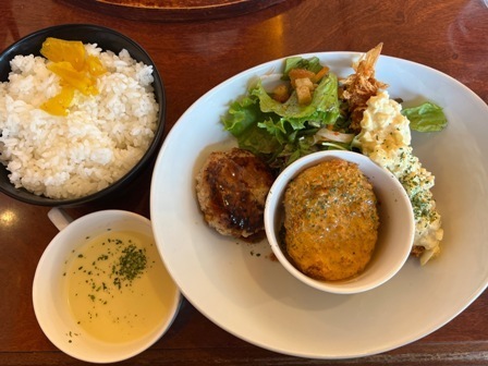 この日はハンバーグ、コロッケ、エビフライの3種盛り!